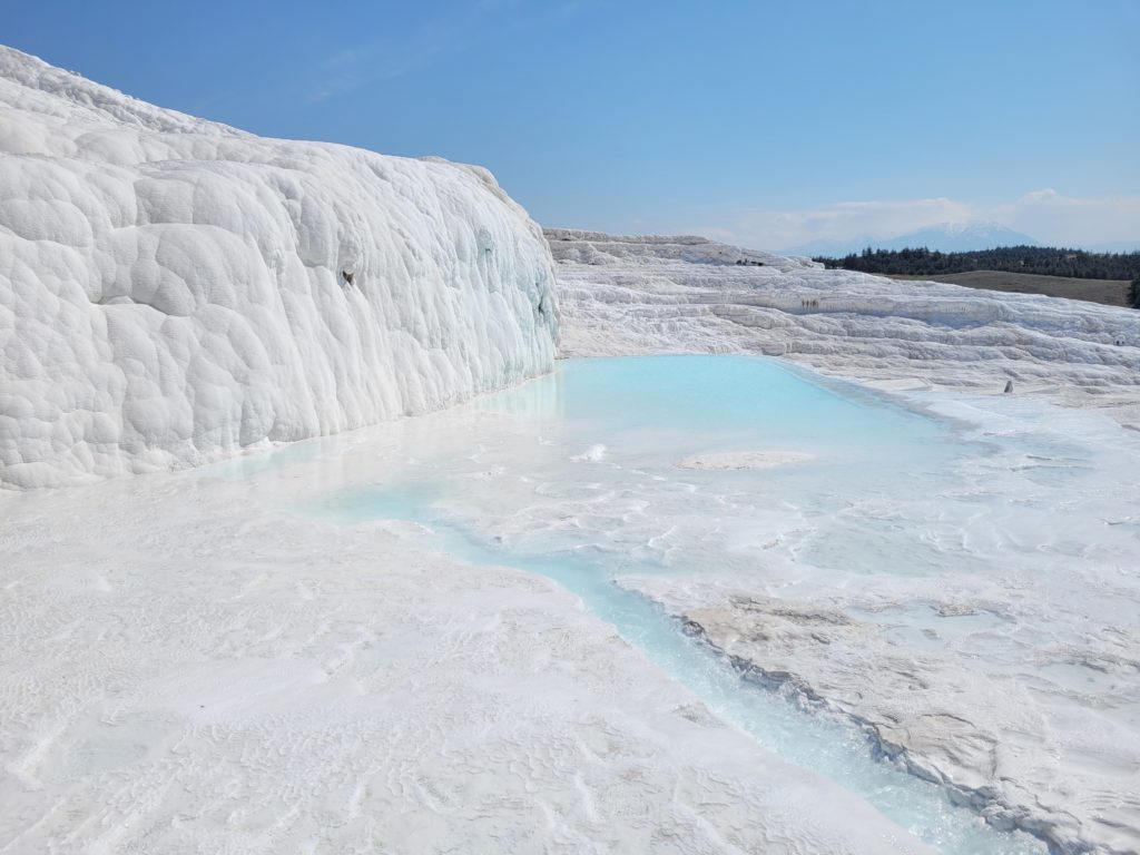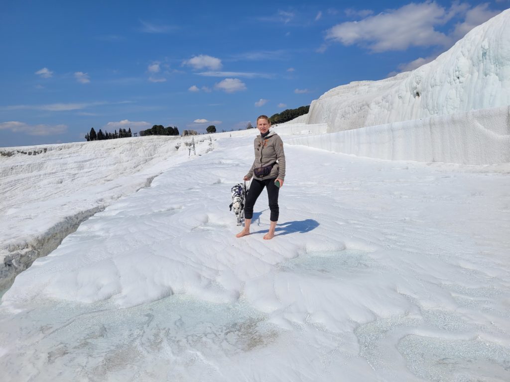 Wegen der Kälte wollten wir eigentlich die Sinterterrassen in Pamukkale nur von außen ansehen. Die durchbrechende Sonne verführte uns aber zur Barfußwanderung auf der wasserumspülten Travertinanlage. (Zur Sauberhaltung der schönen weißen Oberfläche der zum Weltkulturerbe gehörenden Terrassen dürfen diese nur barfuß begangen werden.) Das bergabströmende Wasser war beim Austritt aus dem Berg angenehm warm, sodass die Wanderung keine kalten Füße bescherte.