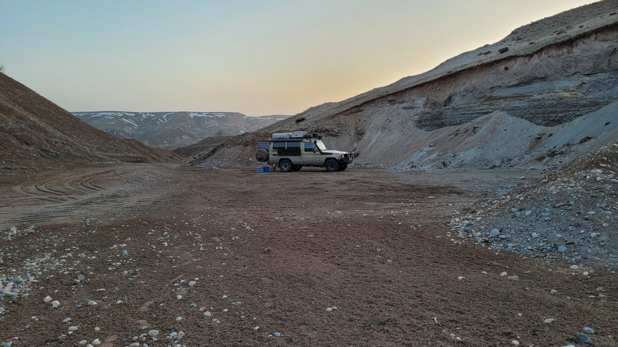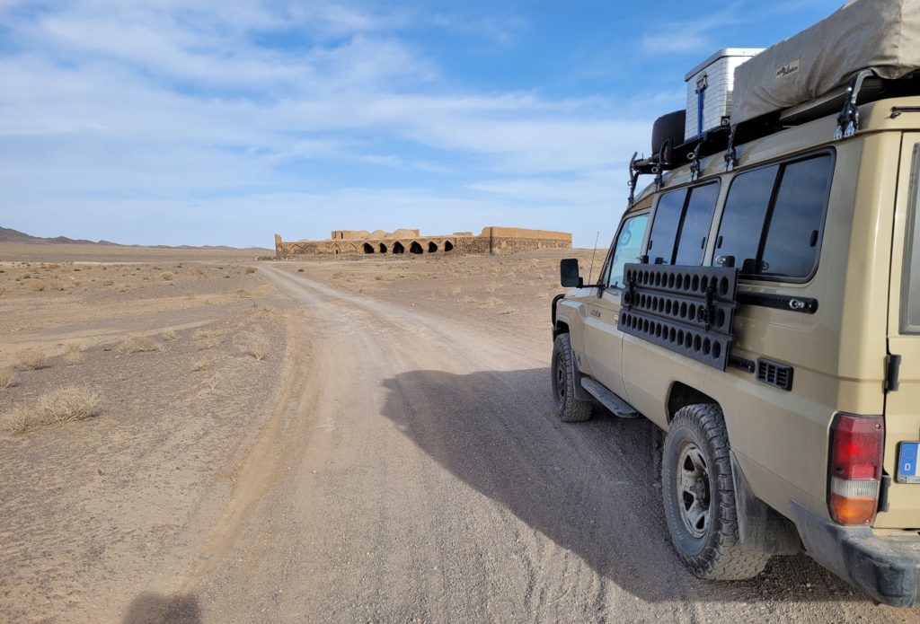 Kargushi- eine alte verlassene Karawanserei sollte unser Übernachtungsplatz sein. Als wir uns näherten, mussten wir entsetzt sehen, wie (durch ein Erdbeben?) zerfallen das Bauwerk war. Der Innenbereich erschien uns gefährlich und wenig einladend, sodass wir den Außenbereich als Stellplatz wählten.