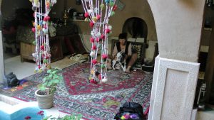 Hostel-HaustürHaustürklopfer für weibliche und männliche GästePasargad, Hostel-InnenhofRuhe- und SpeiseeckeIranisches Abendessen
