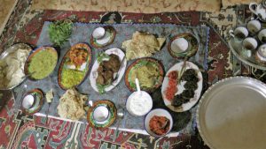 Im Hostel Aghamir Cottage waren wir die einzigen Gäste. Die Tante unseres Gastgebers kochte ein reichhaltiges Abendessen, das wir gemeinsam mit dem Gastgeber und dessen Frau traditionell auf dem Fußboden einnahmen. Die unbekannten Speisen schmeckten vorzüglich.