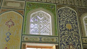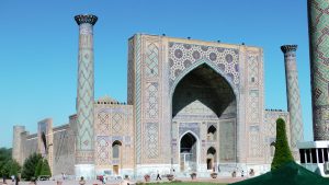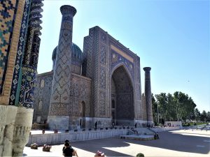Noch bevor viele Touristen den Registan füllten, waren wir an Samarkands größter Sehenswürdigkeit. Der Platz wird von drei Medresen aus drei Jahrhunderten eingerahmt. Die Pracht der riesigen Monumentalbauten ist unglaublich. Die Ausbildung an der einst wichtigsten Religionsschule dauerte 14 Jahre und umfasste auch naturwissenschaftliche Forschung. Ein Führer erklärte uns die Funktionsbereiche sowie die Symbolik.