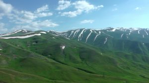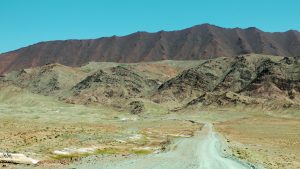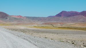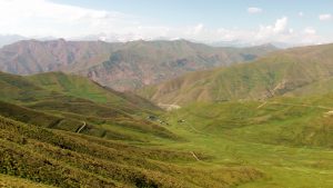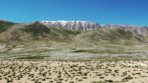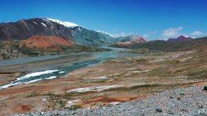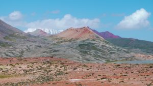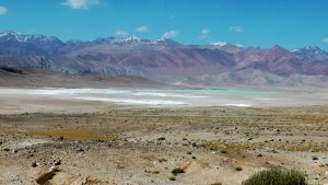 Die Berglandschaft zwischen Karakul und kirgisischer Grenze war wunderschön.: grüne Wiesen, bunte Berge, schneebedeckte Gipfel, blauer Himmel.