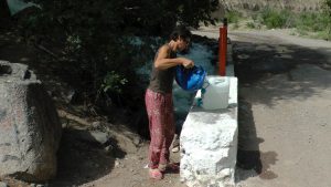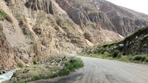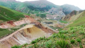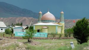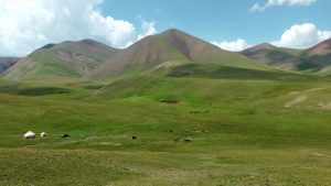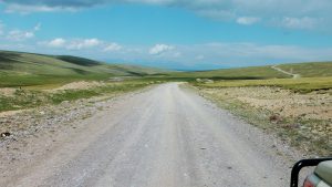 Nachdem wir früh einen kirgisischen Lada Niva mit der Winde aus einem Schlammloch gezogen hatten, fuhren wir auf rauer Piste 2 Stunden über einen Pass durch die Berge des Tien Shan.