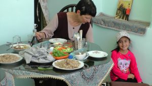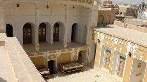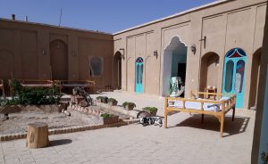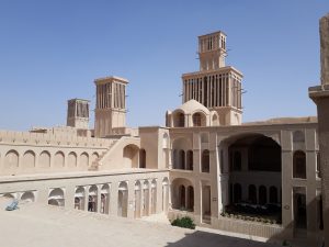 Nach einem üppigen Frühstück zeigte uns Javad die Stadt. Er erklärte uns die architektonischen Besonderheiten traditioneller Wüstenstädte, die besonders schattenspendend angelegt sind. Zunächst besichtigten wir die Windtürme, mit angegliedertem Museum. Javad führte uns auf den Dächern der miteinander verbundenen Gebäude genau zu der Stelle, die der Ansicht auf der 20.000 Rial-Banknote entspricht. Die Windtürme leiten den Wind zu den unterirdischen Wasserspeichern. Die entstehende Verdunstungskälte kühlt einerseits das Wasser und macht es haltbar und andererseits kühlt die Abluft die Gebäude. Nach dem Besuch der Freitagsmoschee sahen wir Handwerkern bei der Herstellung von Filzteppichen zu. Zum Abschluss besichtigten wir eine große Zypresse, deren Alter auf mindestens 4500 Jahre geschätzt wird.
